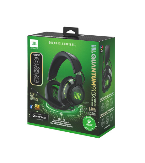 Бездротова гарнітура JBL Quantum 910X Wireless для Xbox сумісна з Xbox™, ПК, PlayStation™ (PS5 та PS4) та Nintendo Switch™, Mac бездротовим з'єднанням 2,4 ГГц, з пристроями, сумісними з Bluetooth по Bluetooth 5.2 і з ПК, PlayStation ™, Xbox™, Nintendo Switch™, Mobile, Mac™ та VR через аудіороз'єм 3,5 мм. Функції JBL QuantumENGINE (JBL QuantumSURROUND, RGB, EQ, мікрофон тощо) доступні лише на ПК. Перевірте сумісність у посібнику з підключення.